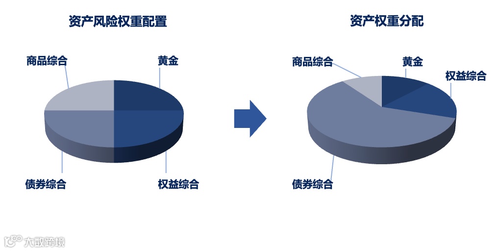经济增长和通胀两大因素驱动的四种经济环境构成全天候经济周期轮动模型。全天候策略给每种经济环境分配相同(各25%)的风险权重,期望通过将风险等量分布于四种经济环境来达到组合的分散和平衡。