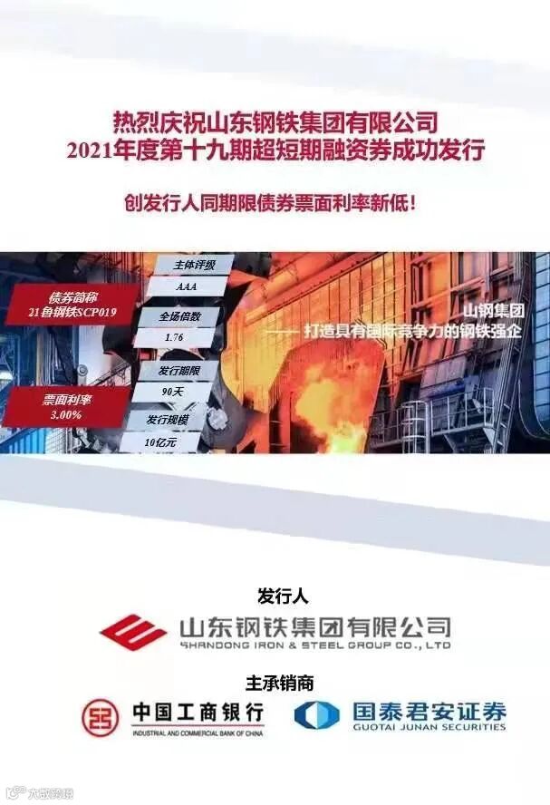 2021年,国泰君安累计为山东钢铁集团有限公司(以下简称“山钢集团”)发行10期债券,融资规模合计111亿元,覆盖债务融资工具和公司债券等品种,积极响应支持产业发展号召,助力山东钢铁集团完成供给侧改革、央地国企改革一系列重要工作。2021年3月23日,国泰君安为山东钢铁集团成功发行10亿元非公开短期公司债券,并搭配创设1亿元信用保护凭证(CDS),创新工具为发行人降低了融资成本,亦为投资人创造新的资产配置选择。7月、11月和12月,国泰君安又陆续为后期发行的“21山钢D2”、“21山钢01”和“21莱钢Y2”合计创设5亿元CDS,为山钢集团引入超120亿市场化认购资金。