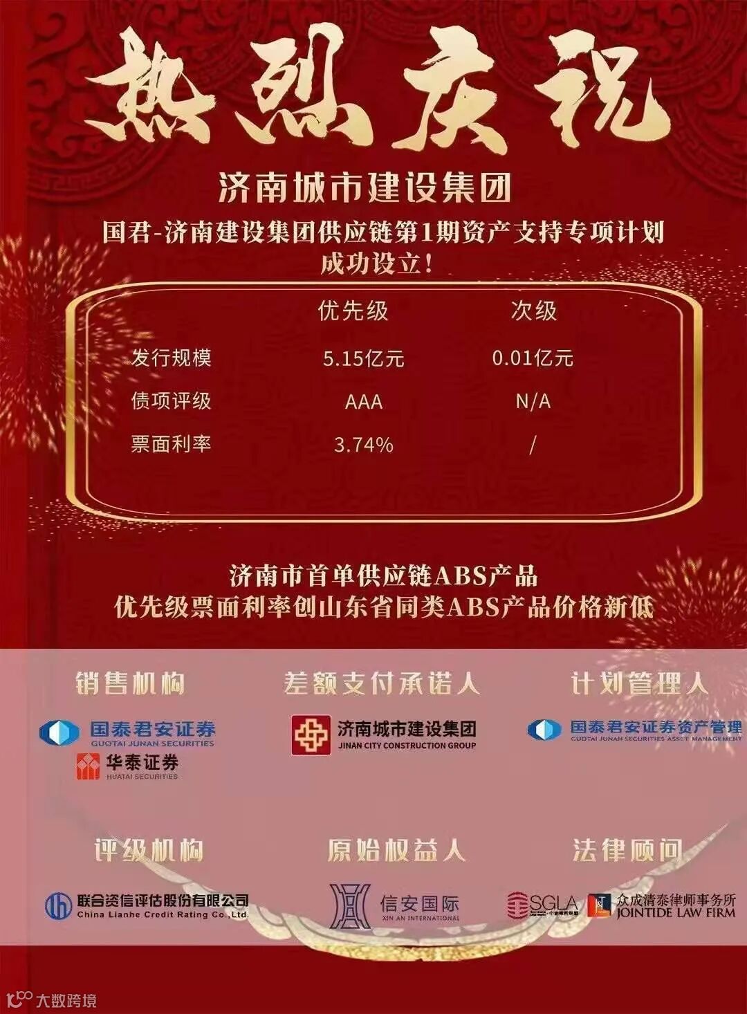 2021年4月30日,国泰君安为济南城市建设集团有限公司成功发行5.16亿元“国君-济南建设集团供应链第一期资产支持专项计划”,优先级票面利率3.74%,为济南市首单供应链证券化产品,优先级票面利率创山东省同类证券化产品价格新低。9月1日,国泰君安再度为建设集团成功发行30亿元的公募可续期公司债,票面利率3.69%,创近年全国同规模3+N年期票面利率最低纪录。