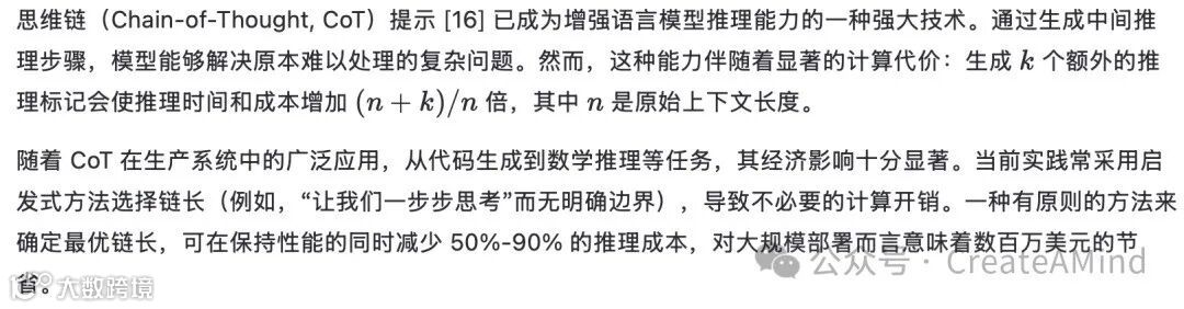 思维链提示(Chain-of-Thought prompting)已成为生产级大语言模型(LLM)系统中的标准实践,但其带来了显著的成本。每个额外的推理标记都会增加: