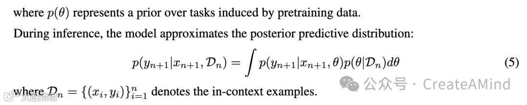 由 [17] 提出的用于上下文学习的贝叶斯框架将预训练分布分解为: