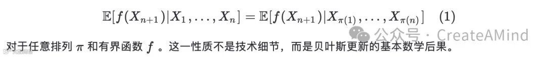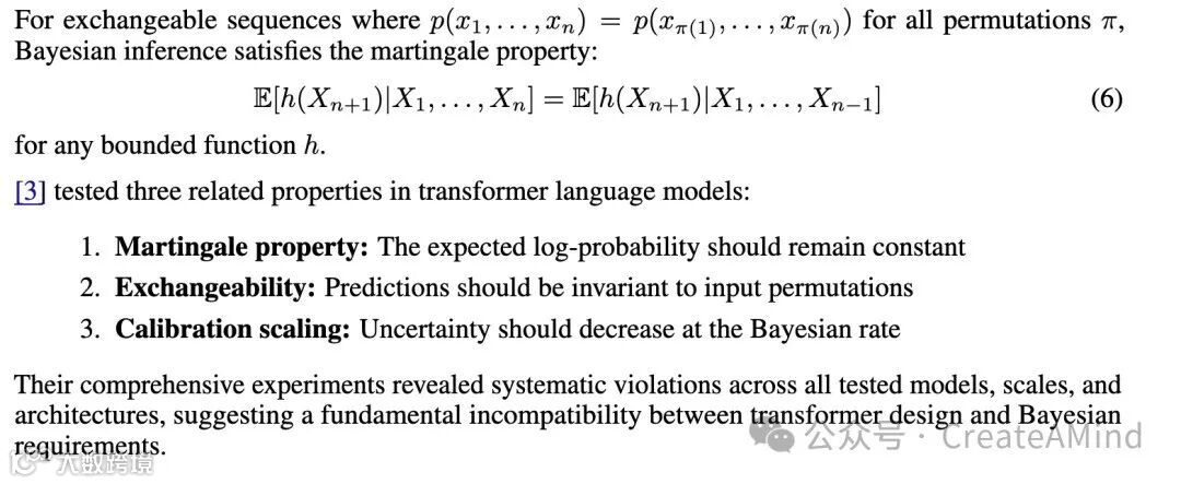 然而,这一理论大厦最近被 [3] 挑战,他们通过实证表明基于变换器的语言模型系统性地违反了鞅性质。对于观察顺序不携带信息的可交换数据,贝叶斯后验预测分布必须满足: