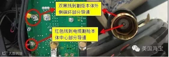 割枪电缆可以按照下图进行检查,将易损件拆下,测量电源板上红色线负极连接点到电割炬本体上的电极、喷嘴和负极连接点到割炬本体上喷嘴和电极连接点是否导通。如果测量不导通,请更换割炬电缆。