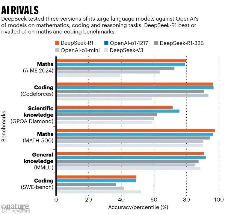 人工智能竞争对手:柱状图显示了DeepSeek进行的测试结果,该测试针对OpenAI的o1模型在数学、编码和推理任务上测试了其大型语言模型的三个版本。DeepSeek-R1在数学和编码基准测试中击败或与o1相媲美。