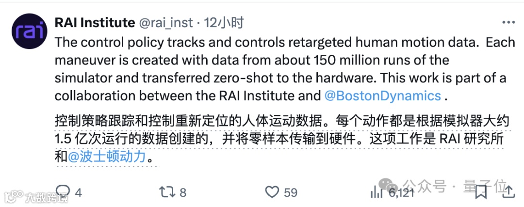 这一训练过程是和波士顿动力创始人Marc Raibert领导的RAI Institute合作进行的,RAI开发的物理模拟器为Altas生成了大量的训练数据。