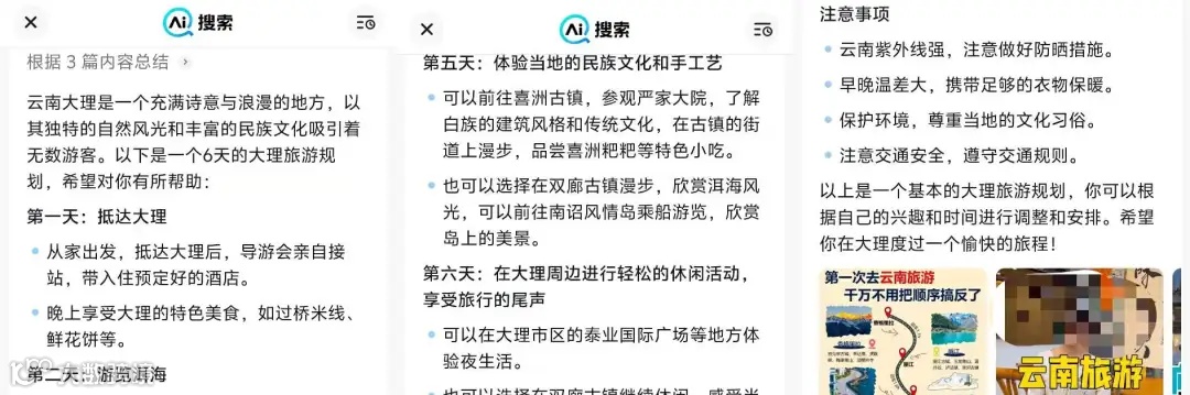 当对两个AI搜索服务,分别输入“我想去云南大理旅游,帮我做一个详细的规划”的问题后,两款AI搜索产品都能在短时间内进行规划作答。