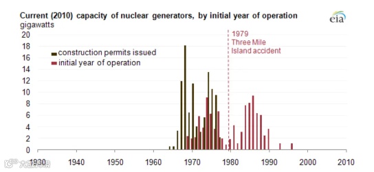 图:美国核电机组大部分在上世纪70年代建成投运;图源:美国能源信息署