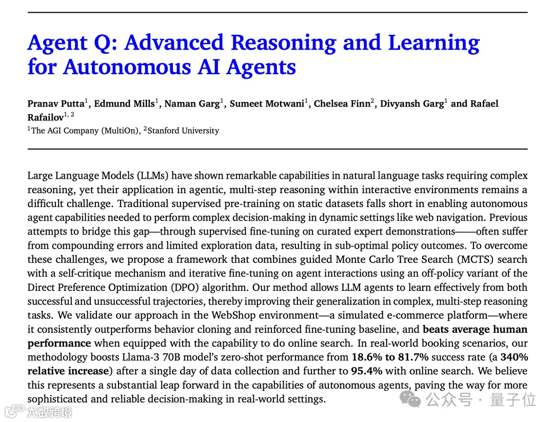 他们最新推出的智能体产品Agent Q,号称拥有做计划和纠正自己错误的能力,可以跨站点浏览、填写表单,zero-shot表现比Llama 3基线提升340%。