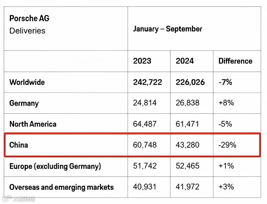 数据显示,2024年前三季度,保时捷全球销量下降7%,交付22.6万辆汽车,其中最大的下降就来自中国市场。