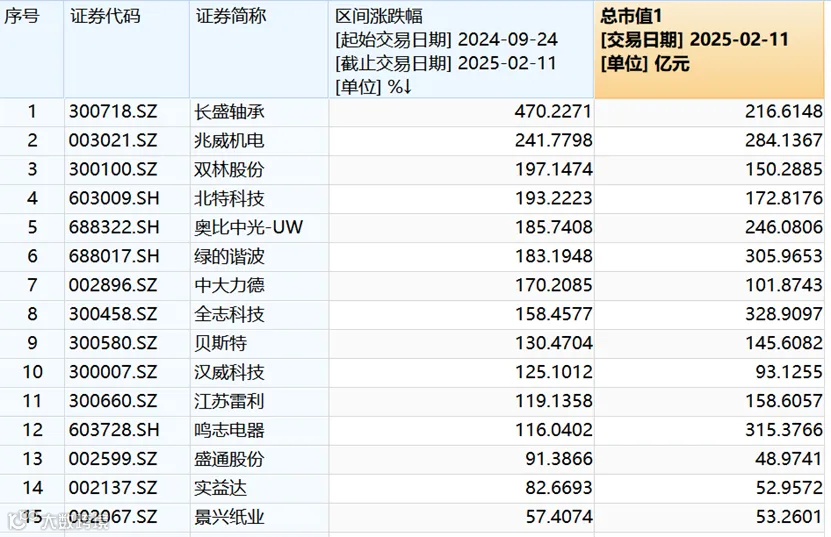 据Wind统计,去年9月24日至今年2月11日,涨幅前三的公司为长盛轴承、兆威机电、双林股份。