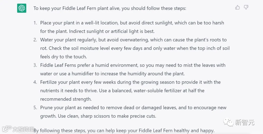 而这次我尝试在ChatGPT上寻找答案,我输入「我怎样才能让我的琴叶蕨植物存活下来」?结果和我从植物公司Easy Plant收到的方案一致。