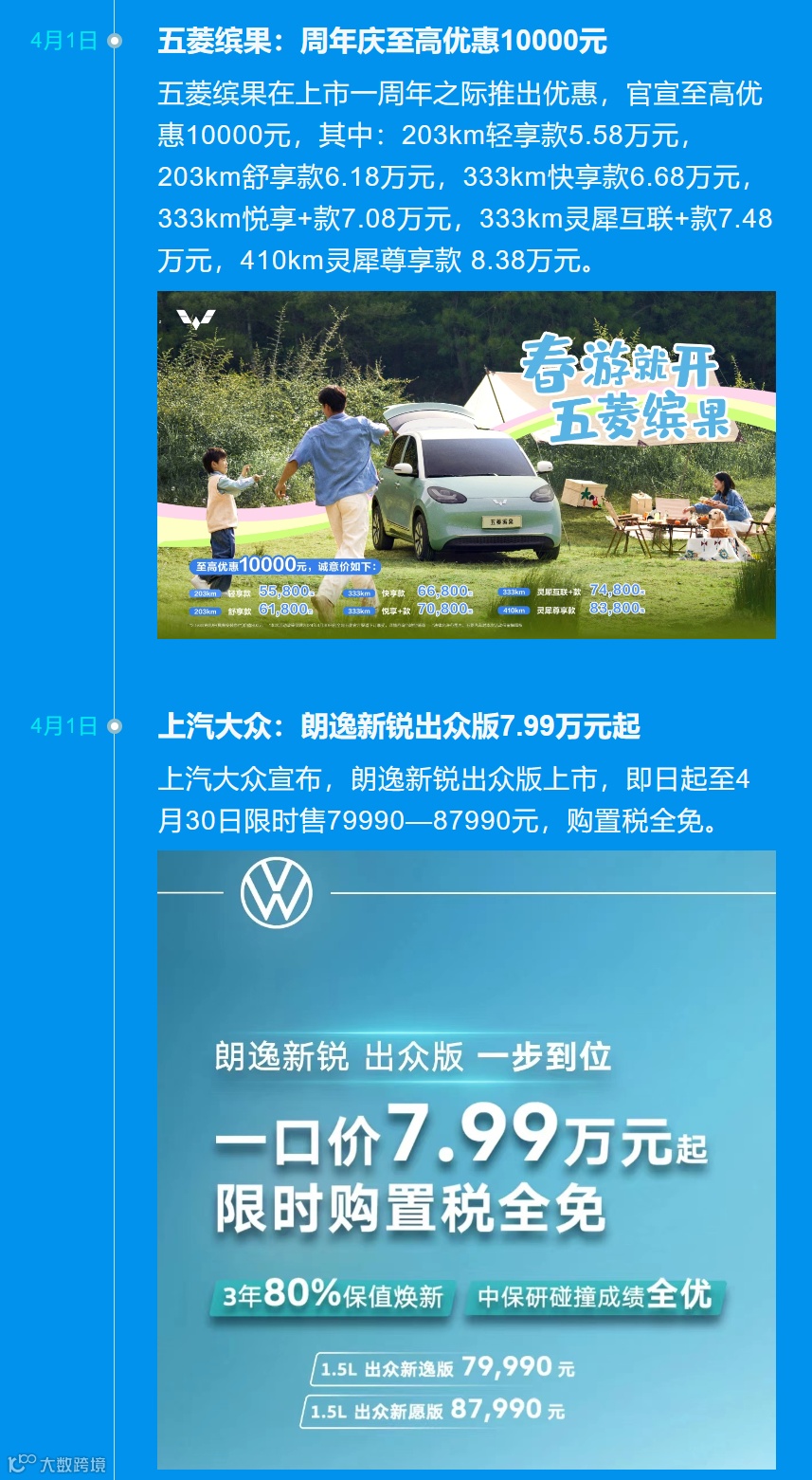 此外,我们梳理,还有包括五菱缤果、上汽大众、极氪、奇瑞、吉利等宣布了降价措施。