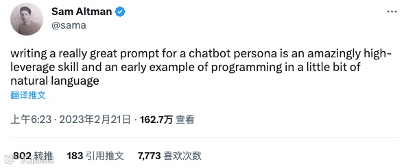 各个公司不惜重金招贤纳士,鼓舞更多人加入提示工程师的行列。就连“ ChatGPT 之父” Sam Altman 也在 Twitter 上表示,“为聊天机器人编写一个非常好的提示是一项非常高杠杆的技能,也是使用自然语言进行编程的早期示例。”