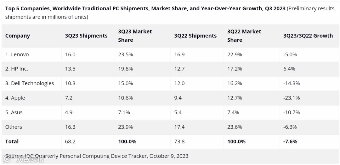 据IDC统计的2023年三季度全球PC出货量及市场份额统计,排名第一的依然是联想,出货量1600万台,市场份额23.5%;