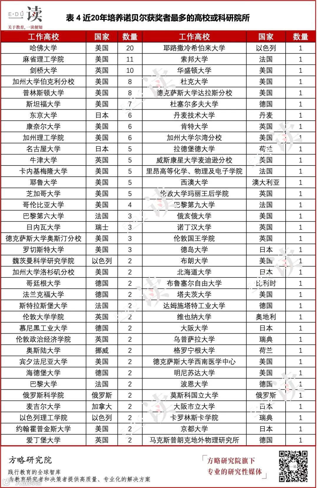 数据说明:我们统计了从2003年至2022年近20年中211位诺贝尔奖获奖者的姓名、获奖时的单位和博士毕业院校,数据主要收集自诺贝尔奖官网,部分数据通过维基百科、百度百科等信息进行补充。考虑到诺贝尔和平奖受意识形态和政治影响较多,本次分析主要涵盖物理、化学、生理学或医学、经济学、文学五类奖项。同时,在进行统计时我们仅包括了工作单位属于高校或科研院所的获奖者。如果获奖者属于多个学术单位,则每个单位都会被计数。人工统计,如有疏漏,欢迎读者留言指出。