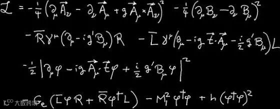 电弱理论是一种场论,它的基本成分是场,其中也包括电场和磁场。方程左侧的由场及场的变化率组合而成,称为此理论的拉格朗日密度。拉格朗日密度是像能量密度那样的东西,根据物理学家从二十世纪三十年代就开始使用的规则,理论中各种场所遵循的方程都方便地蕴含在拉格朗日密度之中。