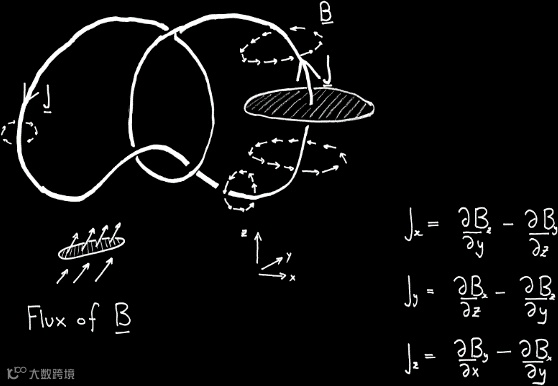 向量场这个概念,比如磁场(或者电流,看作被局限为沿着线圈),是 19 世纪早期数学物理中一个非常重要的观念进展。它为描述电、磁、重力等提供了一个统一的框架。这其中有一个重要的概念是向量场通过某一曲面的通量。数学上,这个定义由曲面积分给出;而直观上,可以把向量场想象成某个流体在每点的流速,那么通量就是流体流过该曲面的流速。