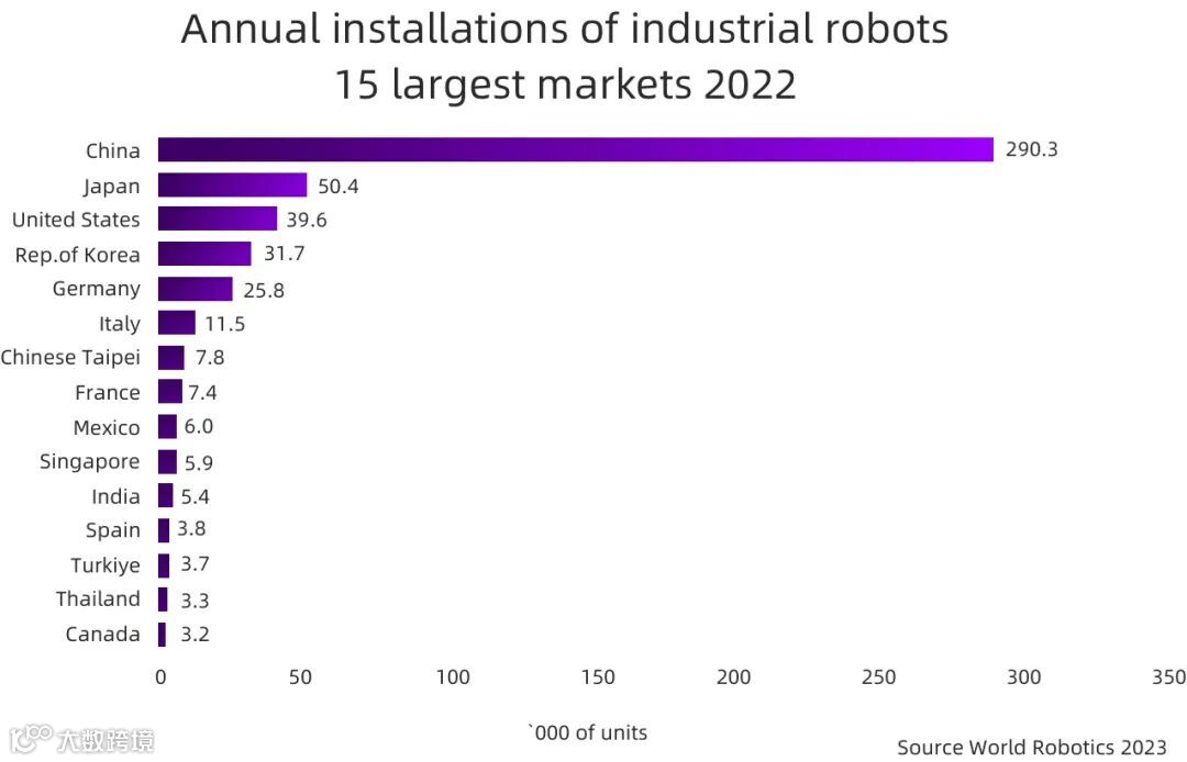 换句话说,中国工业机器人的年安装量,已经占到全球的一半,超过了美日韩德意等国家的总和。