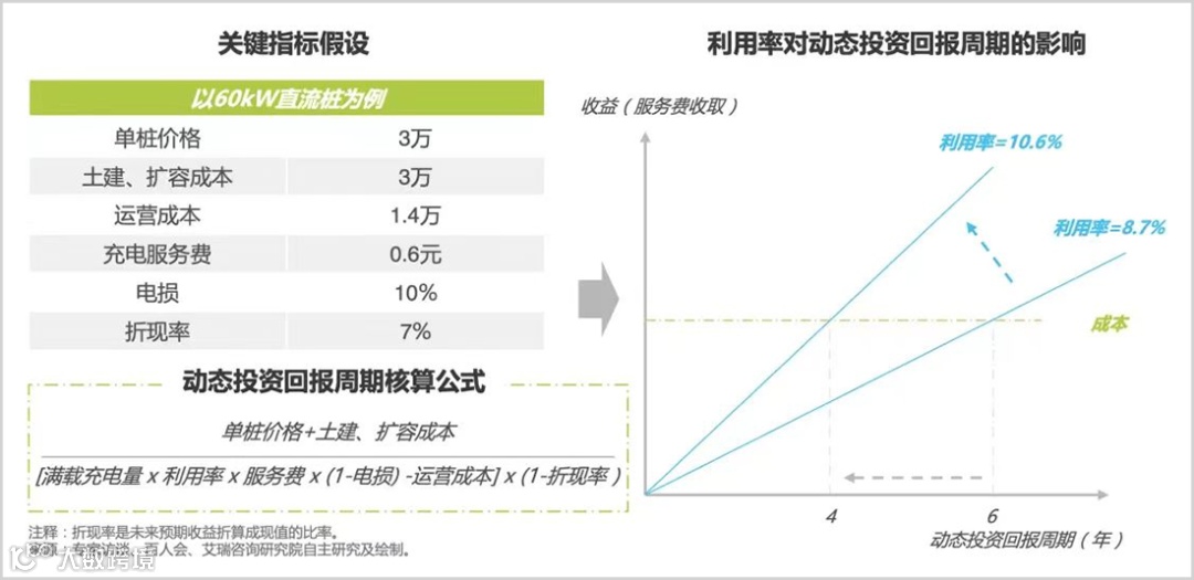 根据艾瑞咨询之前的测算,一根典型的60kW直流桩和7kW的交流桩,在全国平均服务费为0.6元的情况下,如果充电桩利用率提升从8.7%提升到10.6%,投资回报周期将从6年缩短至4年。