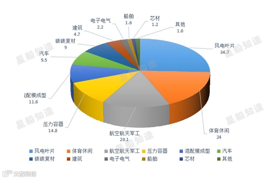 碳纤维需求的应用领域,主要得益于下游的风电叶片和体育休闲——两者拉动明显。
