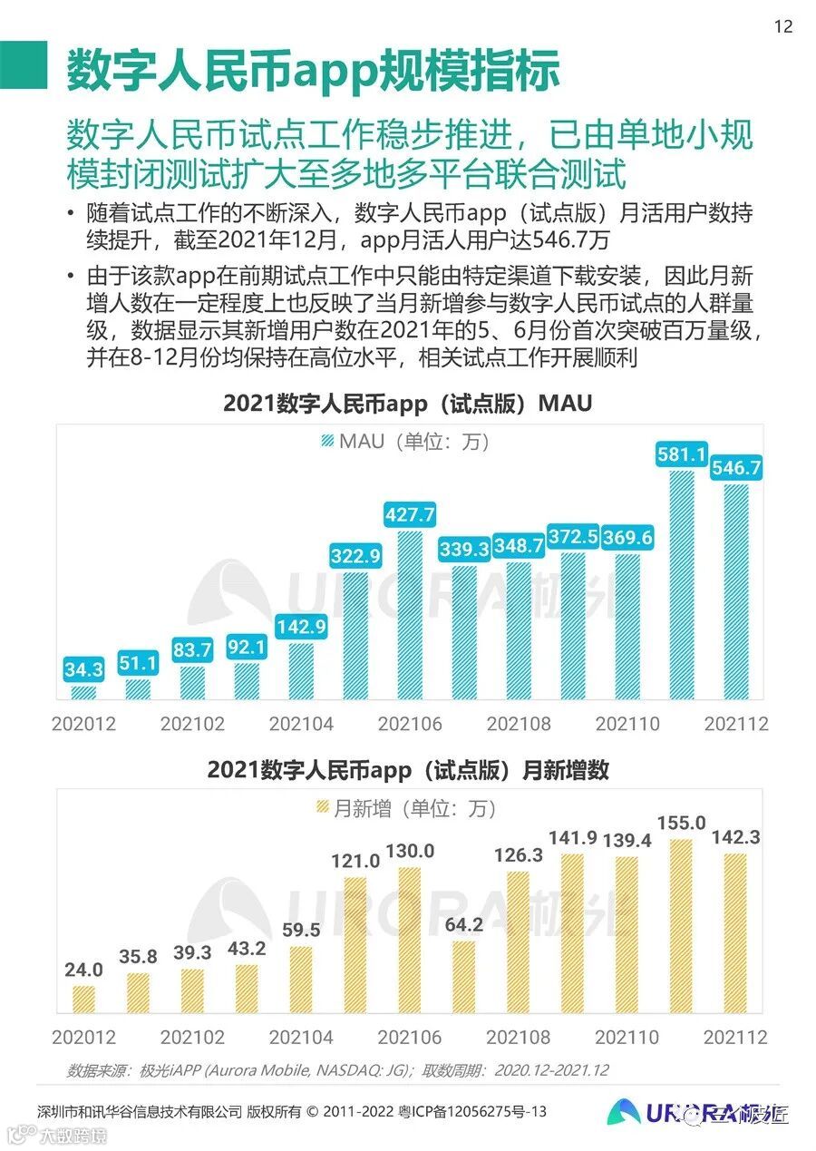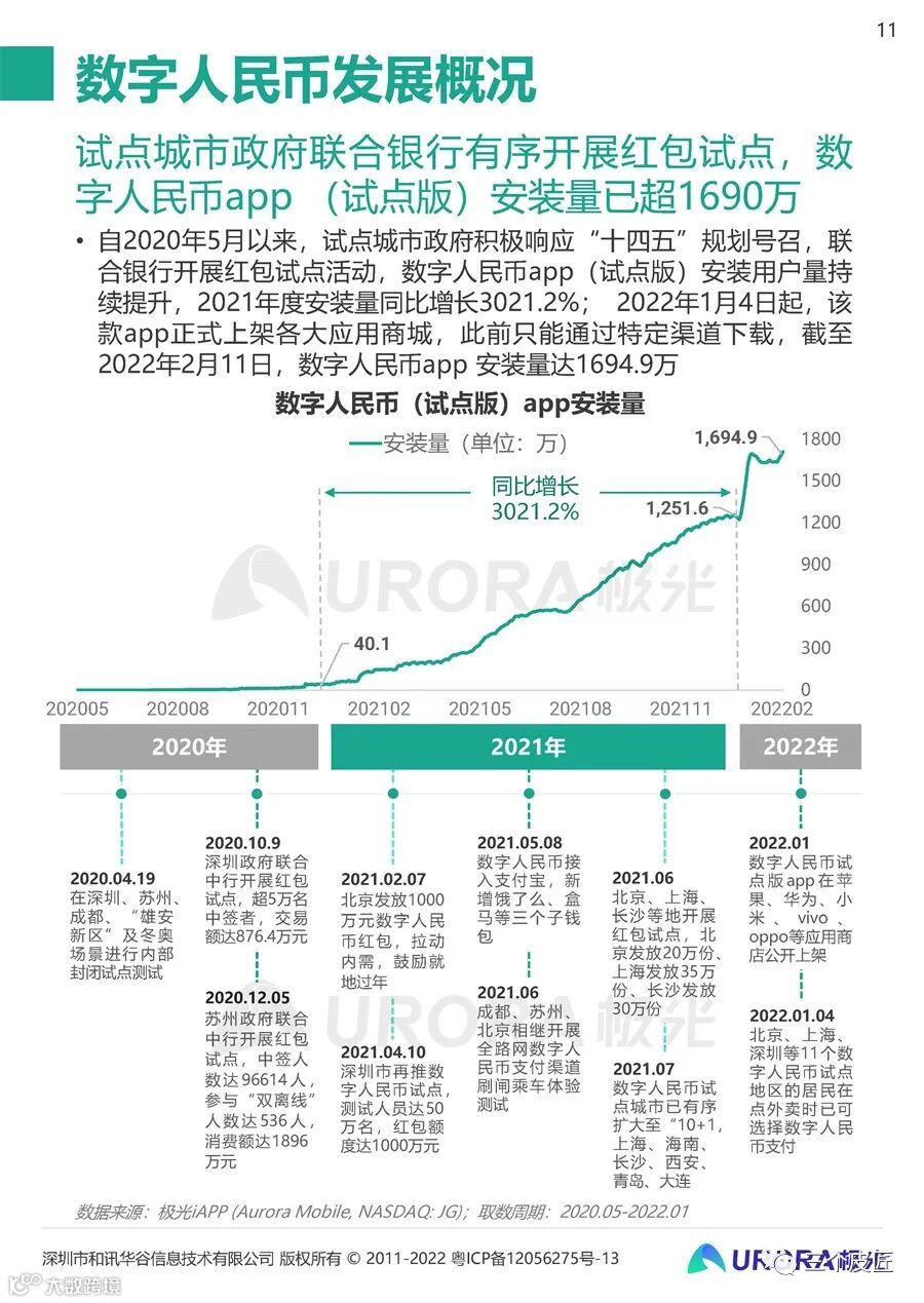 日前,URORA极光发布了《数字经济时代的奇点——2021数字人民币研究报告》(以下简称“研究报告”),研究报告显示,在试点政府与当地银行的紧密配合与有效宣传下,数字人民币的推广正稳步前进,截止至2022年2月11日,数字人民币APP安装量已经达到了1694.9万。