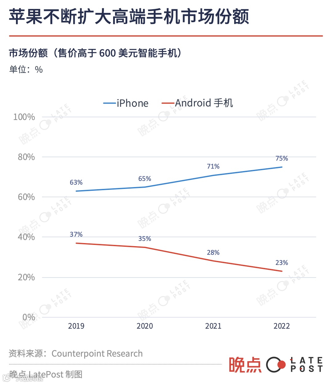iPhone 占全球智能手机销量的份额已经从 2019 年的 13% 增长至 2022 年的 18%。
