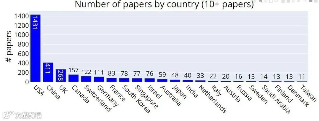 不出意料,美国依然霸榜投稿最多的国家,共提交了1431篇论文,占了总投稿的15.7%。