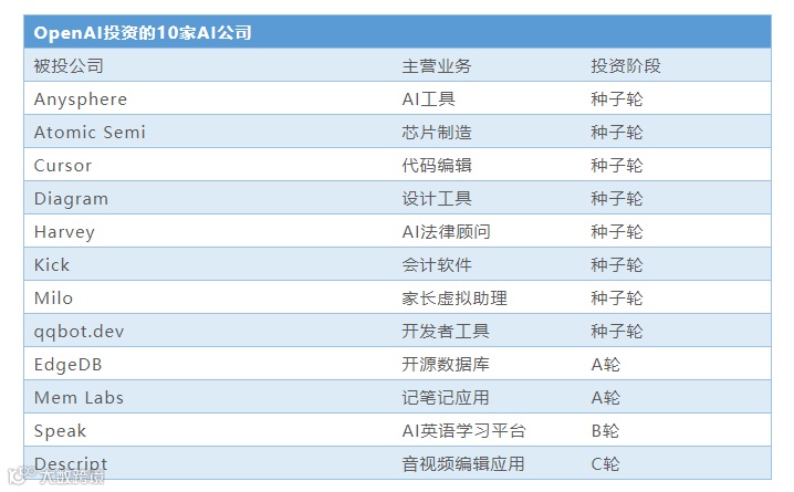 就在上个月,OpenAI推出了加速器Converge,该加速器已经投资了10家公司,这些公司既包括AI工具,也包括AI在具体领域的应用,投资轮次多为种子轮。