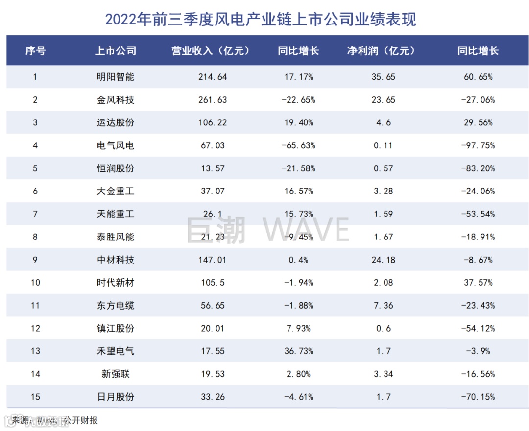 从已公布的2022年前三季度业绩来看,风电产业链的上市公司,从铸件、塔筒、叶片到整机,绝大多数营收和净利润均双双下滑,能实现利润增长的企业屈指可数。