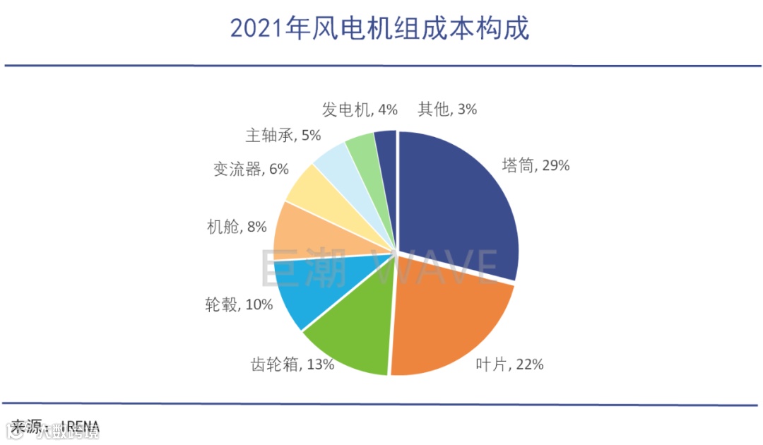 风电机组最大的成本在于塔筒、叶片、齿轮箱、轮毂以及变流器、发电机等关键部件,主要原材料则涉及钢铁、铜材、环氧树脂等材料。