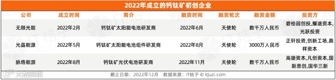 IT 桔子梳理发现,2022 年成立的新经济公司中与钙钛矿有关的公司共有 3 家,且 3 家都于年内完成了天使轮融资。