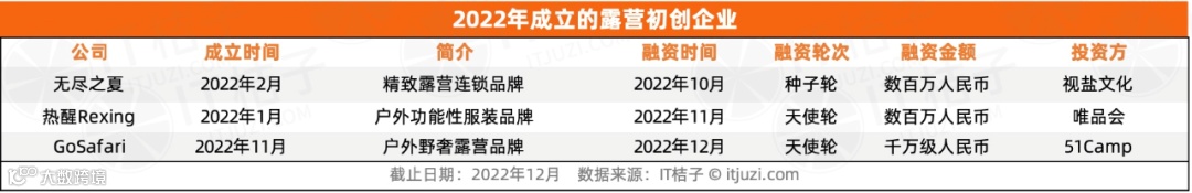 IT 桔子数据显示,2022 年有三家与露营相关的初创企业获得了融资,其中户外野奢露营品牌「GoSafari」获得了来自 51Camp 千万级别的天使轮融资;