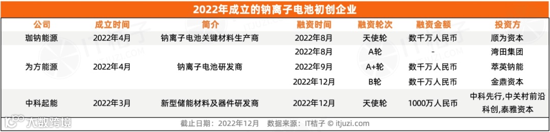 IT 桔子数据显示,2022 年内中国新成立三家钠离子电池企业,覆盖钠离子电池材料和钠离子电池的研发。