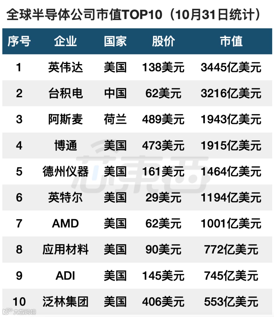 全球半导体上市公司市值TOP10(10月31日统计)