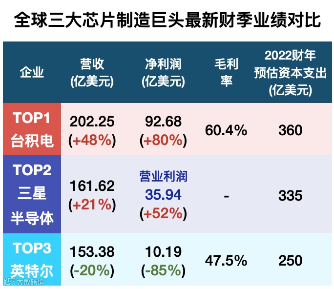 芯片制造三巨头中,中国台湾晶圆代工龙头企业台积电的业绩可谓碾压全场,风头无二。