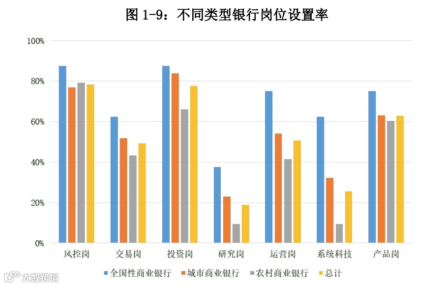 “在系统科技类岗位方面,全国性银行最为重视系统的建设及金融科技的应用,相关岗位设置比例高达62.50%,与之相对,农商行的设置比例不到10%。在研究类岗位方面,全国性银行和城商行的岗位设置比例超过整体平均水平,分别为37.50%、22.99%。”