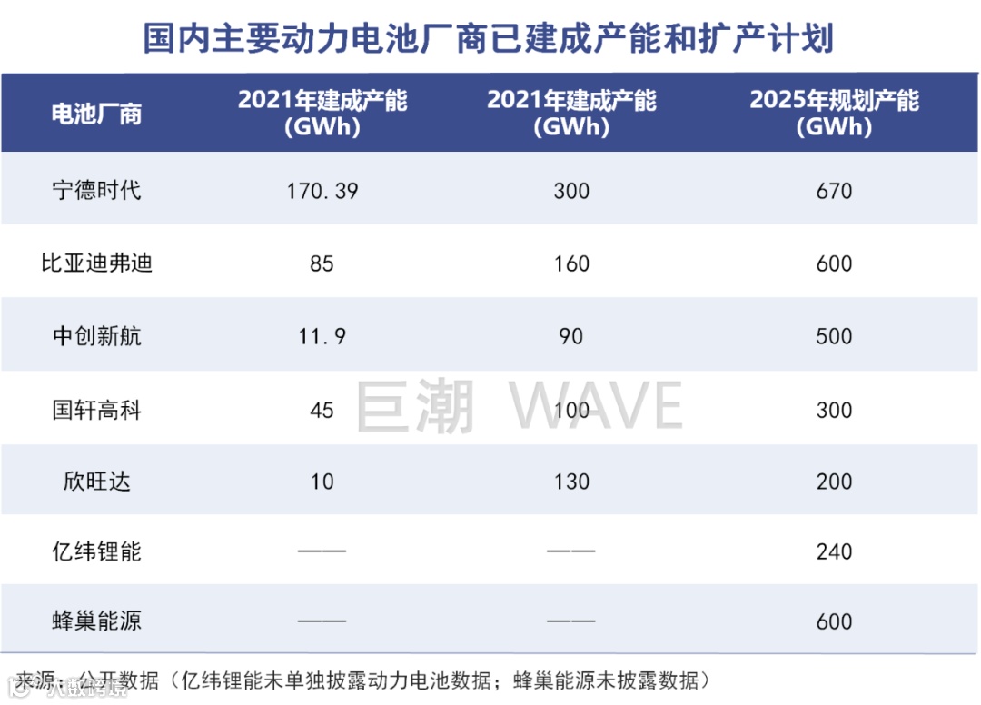 根据公开信息,以2025年为时间节点,宁德时代产能规划为839GWh,比亚迪产能规划超600GWh,蜂巢能源产能规划为600GWh,中创新航产能规划为500GWh,国轩高科产能规划为300GWh。