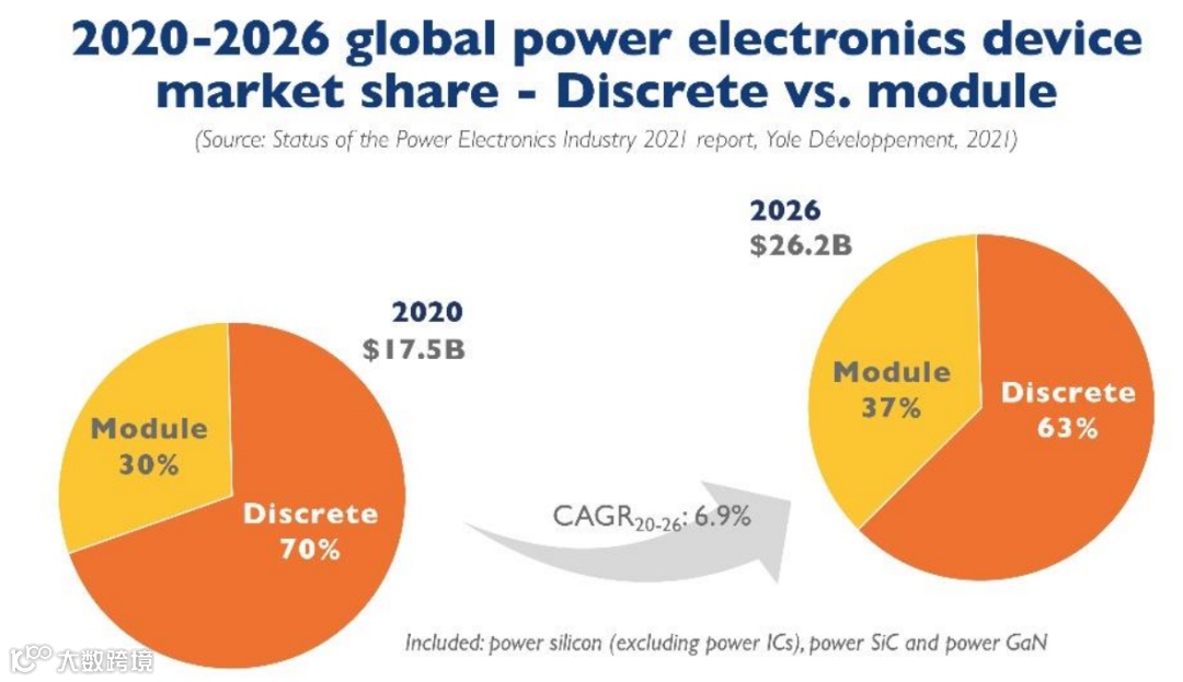 当前功率器件市场仍由分立器件主导,但未来几年功率模块份额将显著增加。