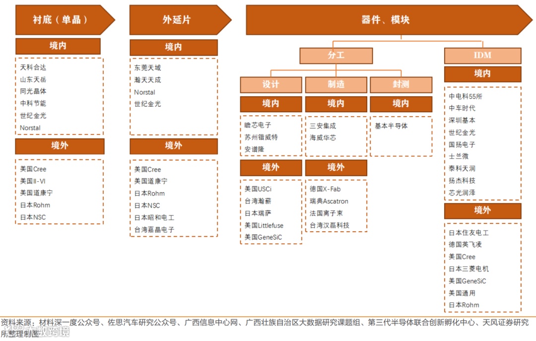 SiC和GaN宽禁带功率器件方面与国际先进国家相比,研发基础较为薄弱,产业化还处于初始阶段,但在衬底、外延片、器件/模块上均有相关企业布局。