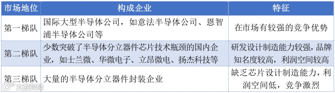目前全球功率半导体公司分为三个梯队,第一梯队为国际领先的大型半导体公司,第二梯队为国内技术突破公司,第三梯队为一些分立器件封装企业。