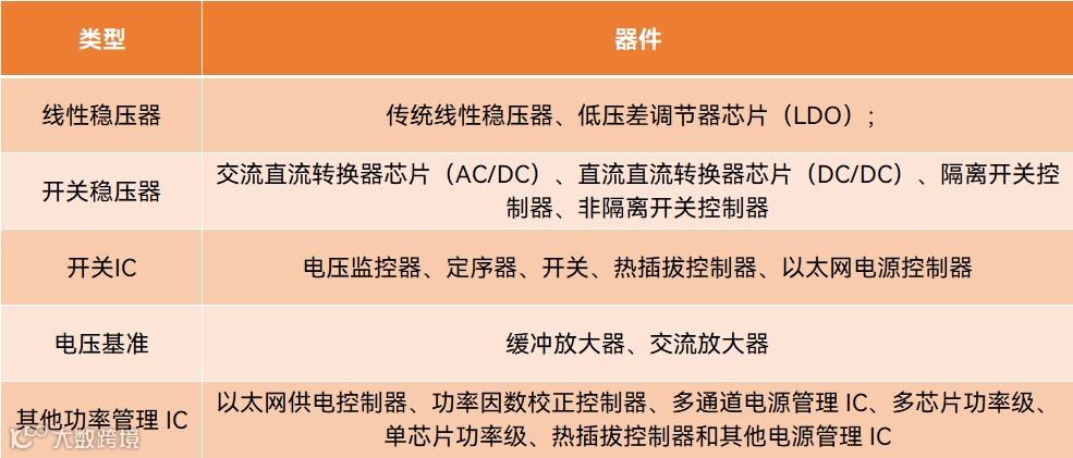 功率IC包括线性稳压器、开关稳压器、开关IC、电压基准、功率管理IC五个大类。