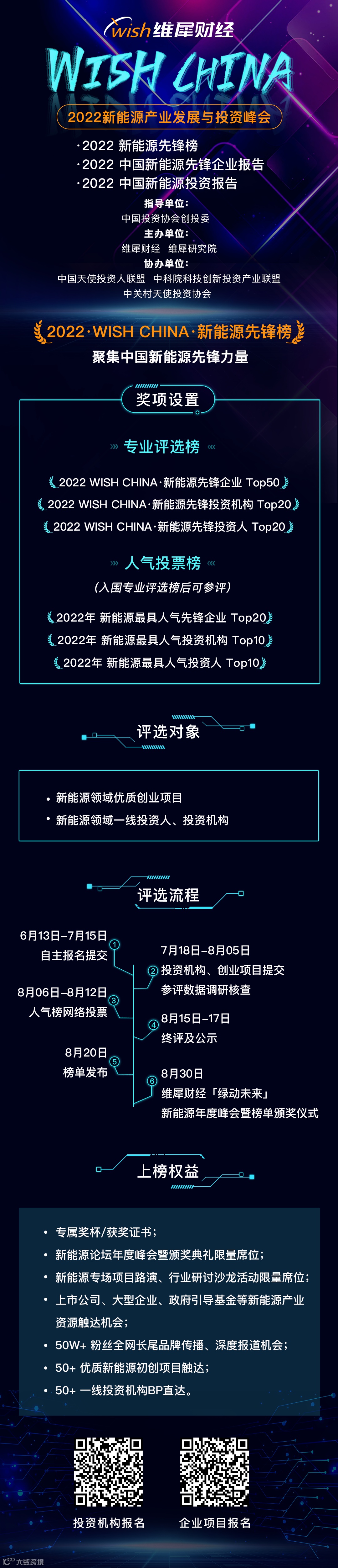 「WISH CHINA · 寻找2022中国新能源先锋力量榜单」评选正式启动。点击海报,了解活动详情↓↓