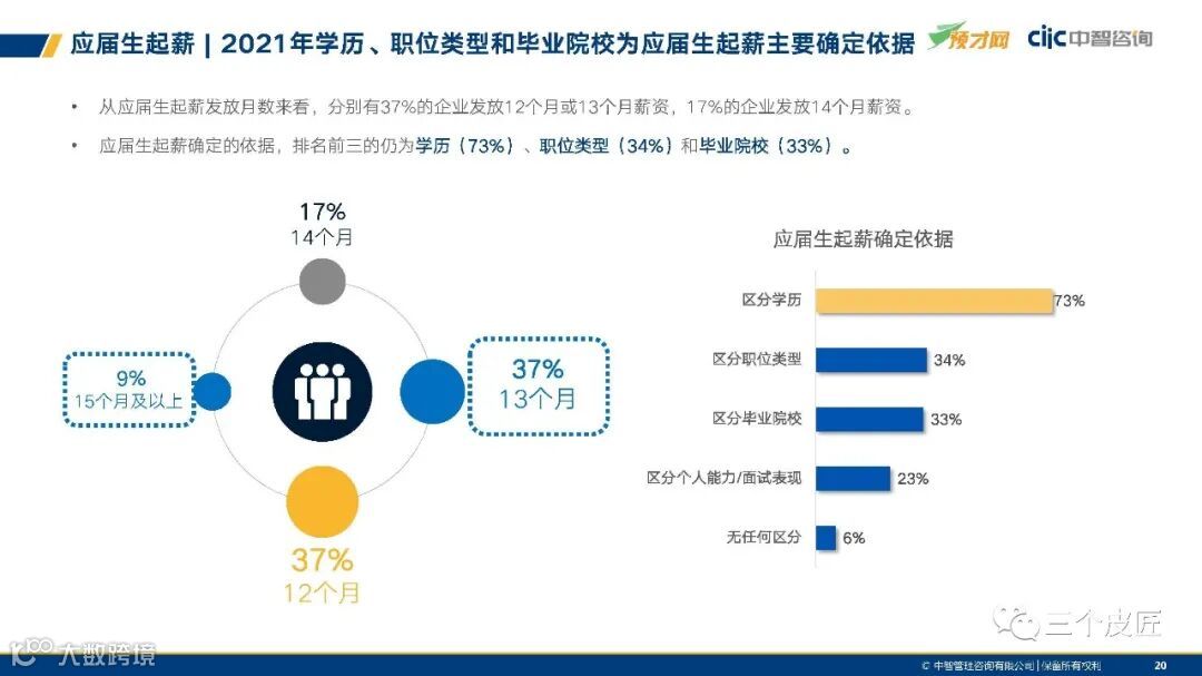 应届生期望薪资与企业起薪:本科生的期望月薪在万元以下,硕士普遍期望过万。半数企业上调2021年应届生起薪水平,37%的企业整体上调,平均涨幅为9%,优质生源/紧缺岗位起薪平均涨幅为15%。博士生起薪平均近1.3万,相比2020年上涨8%左右,硕士和本科应届生起薪平均上涨6%-7%。重点院校硕士生起薪相比普通院校高出35%。