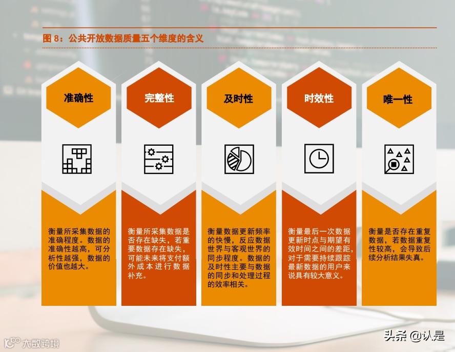 公共开放数据质量调整系数则是第三方数据资产专家 根据数据资产的特性,从公共开放数据的准确性、完 整性、及时性、时效性,及唯一性等五个维度逐一进行打分评价,再经过加权平均后最终得出的结果。