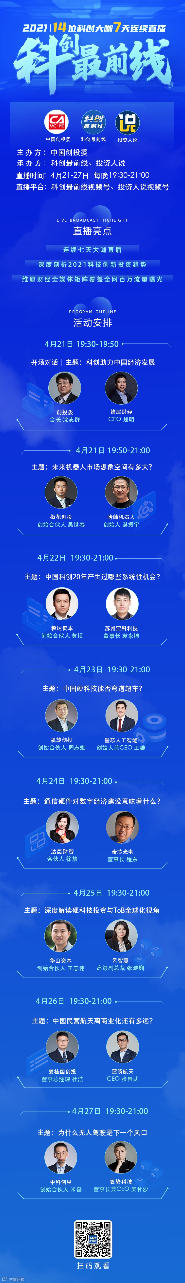 这档节目将由我来主持,从4月21日起,每晚我将邀请一位创投行业顶级投资人,和该投资人所投资的优秀企业,以对话的形式,共同探讨创业投资对新经济、新科技、新发展的重要意义和独特作用。