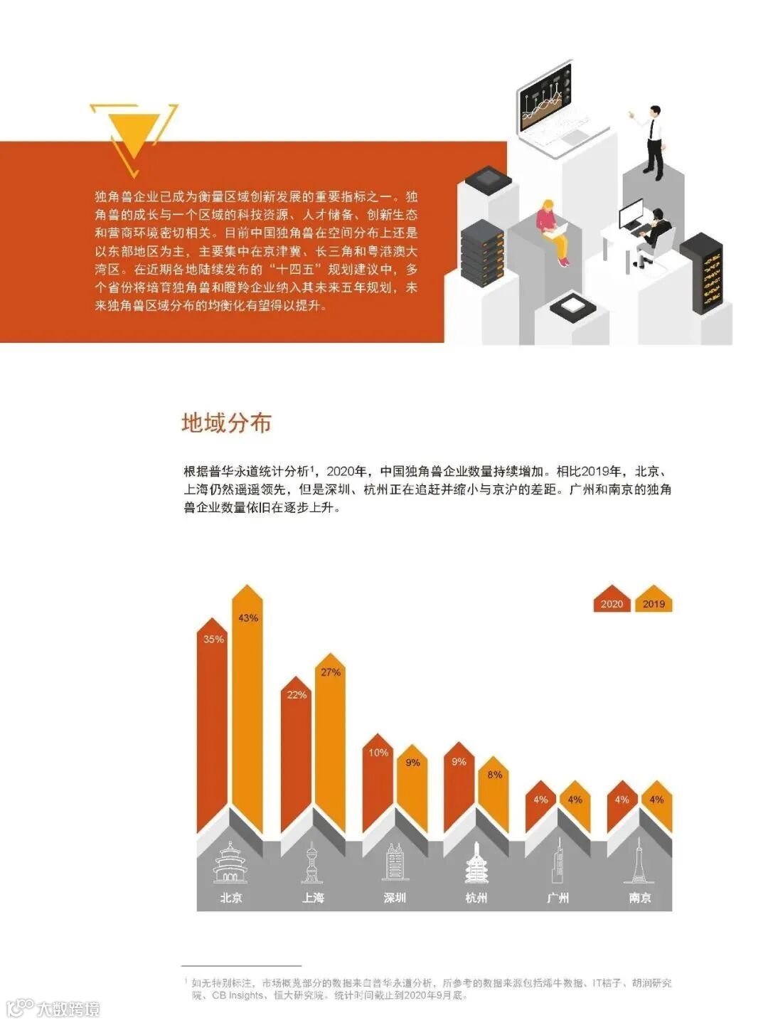 受新冠疫情叠加国际政经形势影响,独角兽企业出海节奏有所放缓。2020年,59%的受访企业表示暂缓或尚未有海外拓展计划,而2019年仅有25%的受访企业表示暂无海外拓展计划。亚太地区继续蝉联独角兽海外拓展的首选(36%),其中东南亚依旧是最受欢迎的区域(47%)。随着《区域全面经济伙伴关系协定》(RCEP)和中欧投资协定尘埃落定,将为区域内创新型企业搭建更广阔的市场平台,推动中国独角兽企业国际化水平的进一步提升。