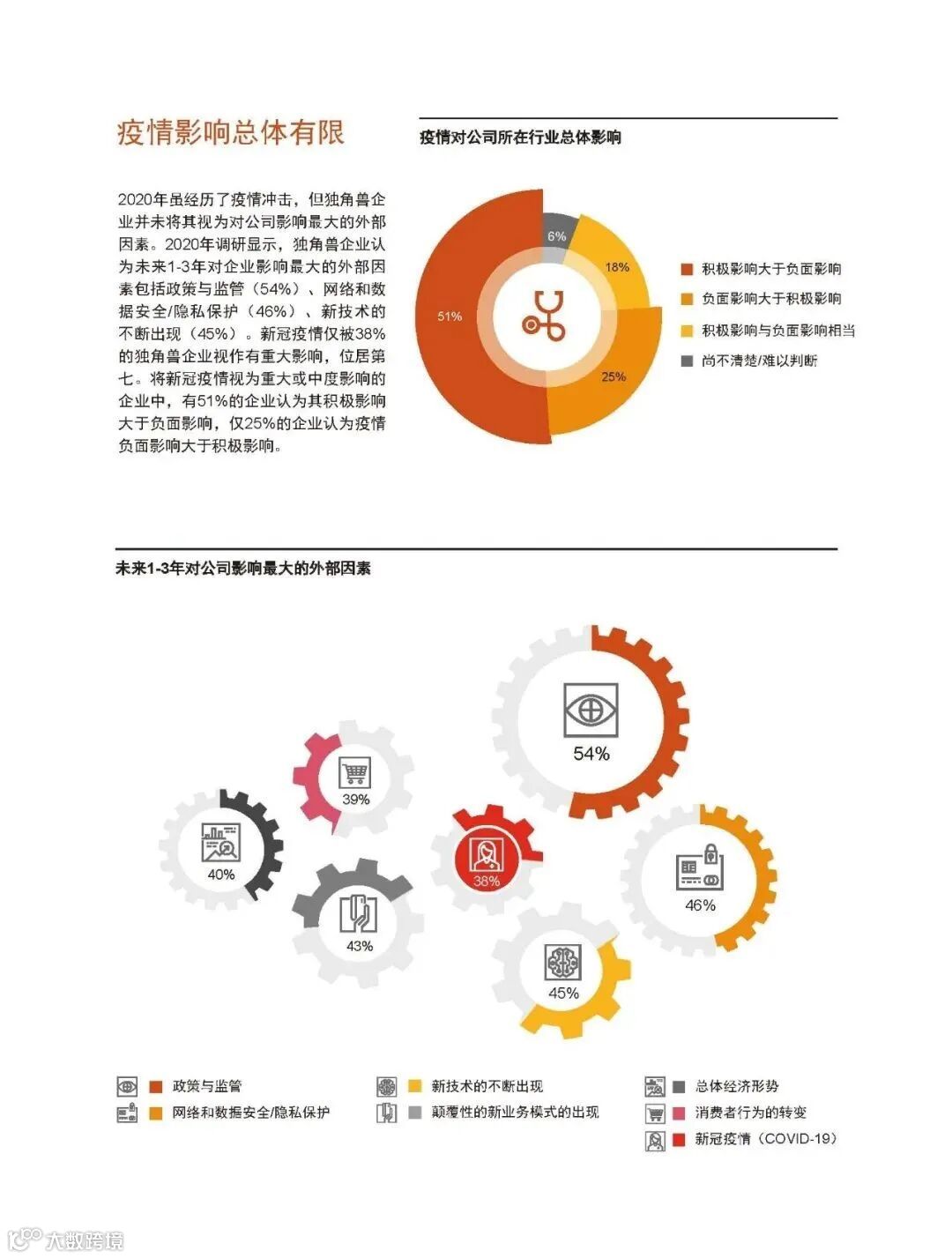 新冠疫情冲击下,全球经济受到重创,中国经济率先引领复苏。代表新经济发展的独角兽企业在疫情期间展现出强大的韧性与生机。2020年调研发现,总体而言,疫情对中国独角兽影响偏向积极,仅38%的受访企业将其视为重大影响。在将疫情视
