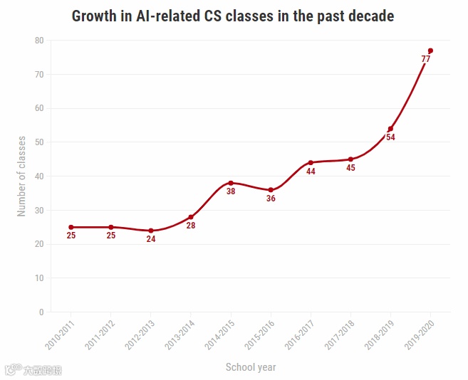 在过去的 10 年中,与 AI 相关的计算机科学课程总数从 25 个增加到 77 个,增长了两倍多。2014 年课程数量首次跃升后,从 2015 年开始,课程数量一直呈稳定增长,2018 年至 2020 年,增长速度达到最大。