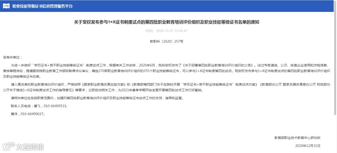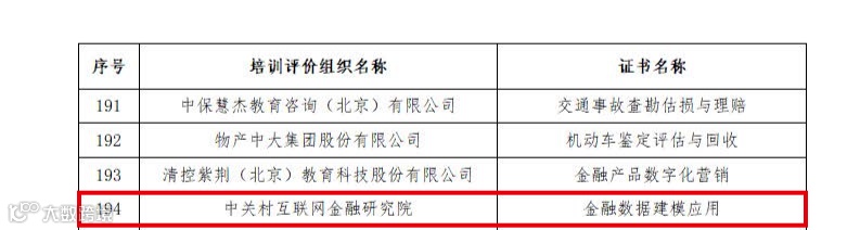 2020年12月31日,教育部职业技术教育中心研究所发布《关于参与1+X证书制度试点的第四批职业教育培训评价组织及其证书》名单,中关村互联网金融研究院(以下简称:研究院)入选1+X证书制度试点第四批职业教育培训评价组织,开发的《金融数据建模应用》入选第四批职业技能等级证书。该证书标准由研究院联合中国人民大学、中央财经大学、