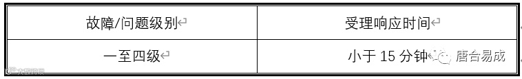 响应时间:我们在收到用户以电话、电子邮件等方式提出的服务请求后,到与用户明确服务内容,开始进行故障定位或开始制定解决方案的时间。具体承诺见表: